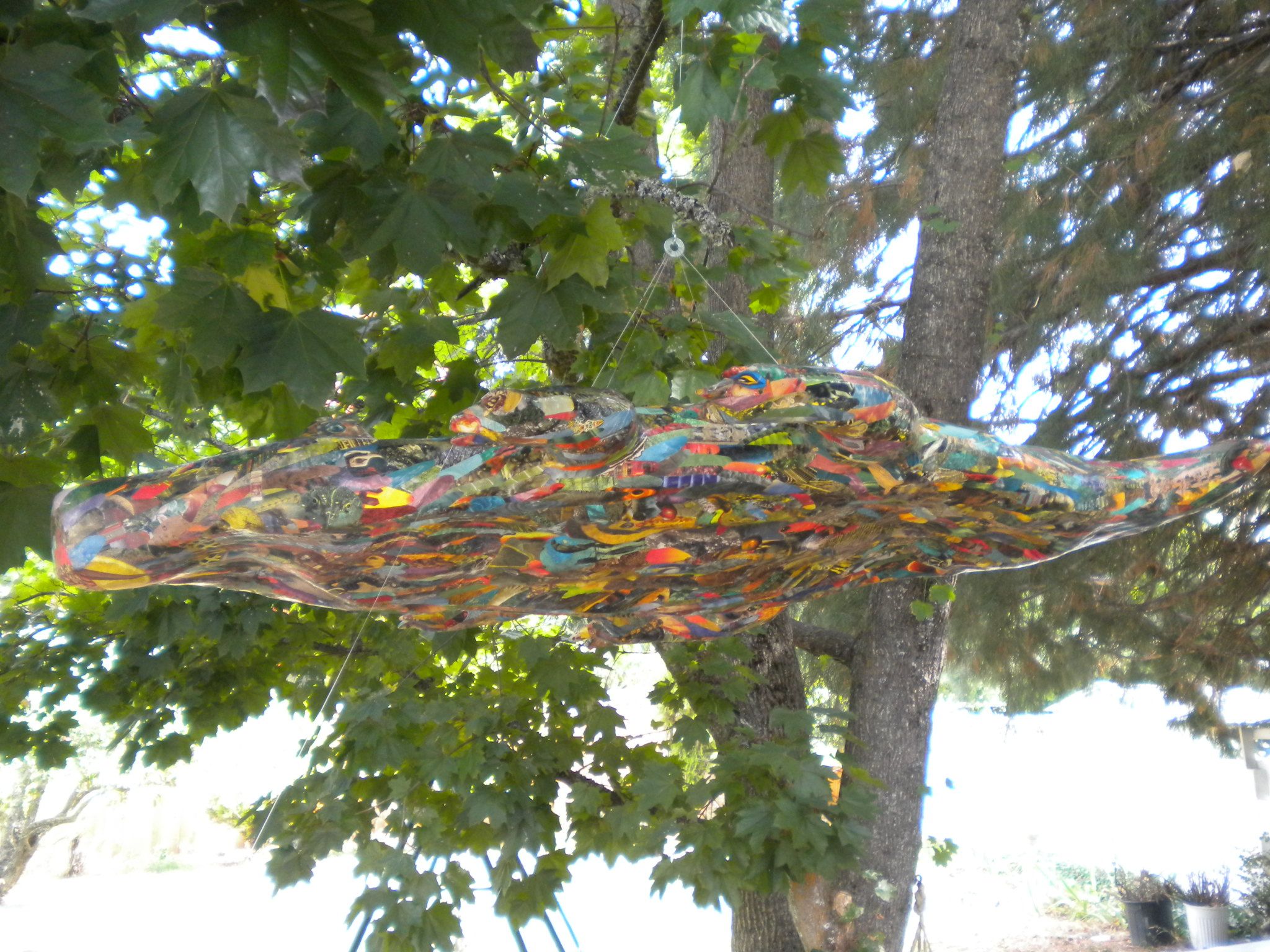 Only a few people have viewed my original once-inflatable sculptures in their natural habitat–my basement and the trees behind my home. The sculptures are made from papier-mache and entirely covered with thousands of colored images, cut from magazines and catalogs, and protected with generous layers of natural-based sealant. They began with a desire to add a third-dimension to the collage experience by creating objects that possessed their own space in a room, like most humans, rather than laying flat inside a frame or on a shelf. They each appeared very clearly in mind before construction began. And each required 200-300 hours to complete.