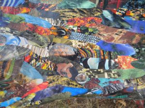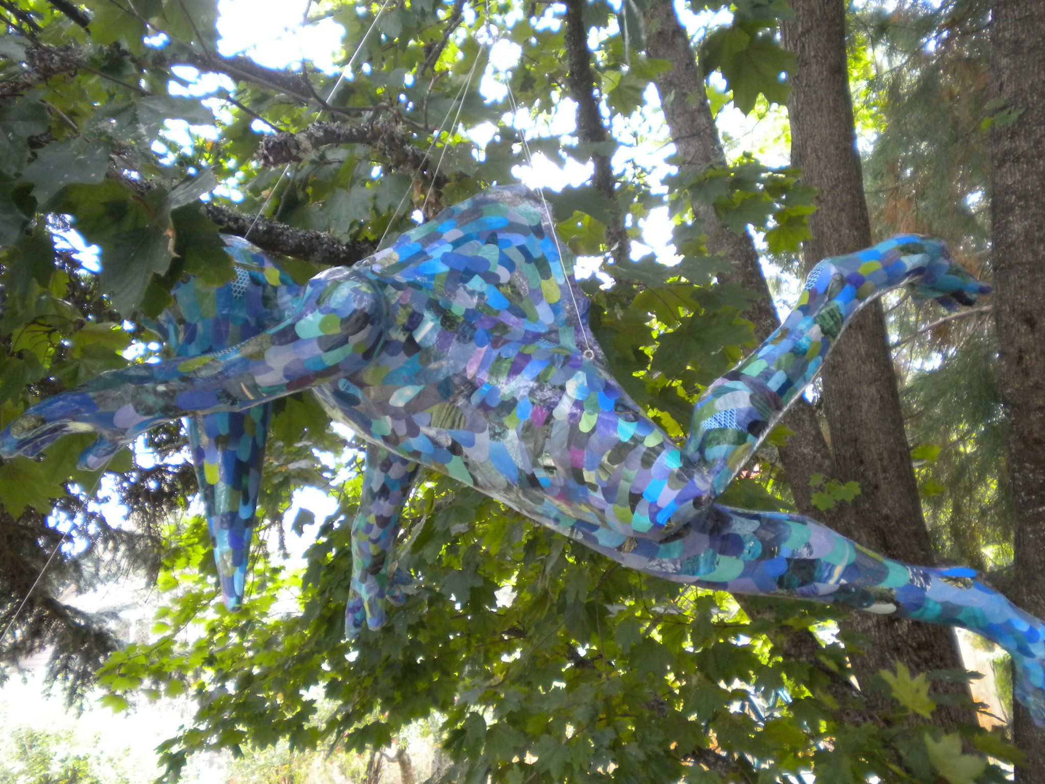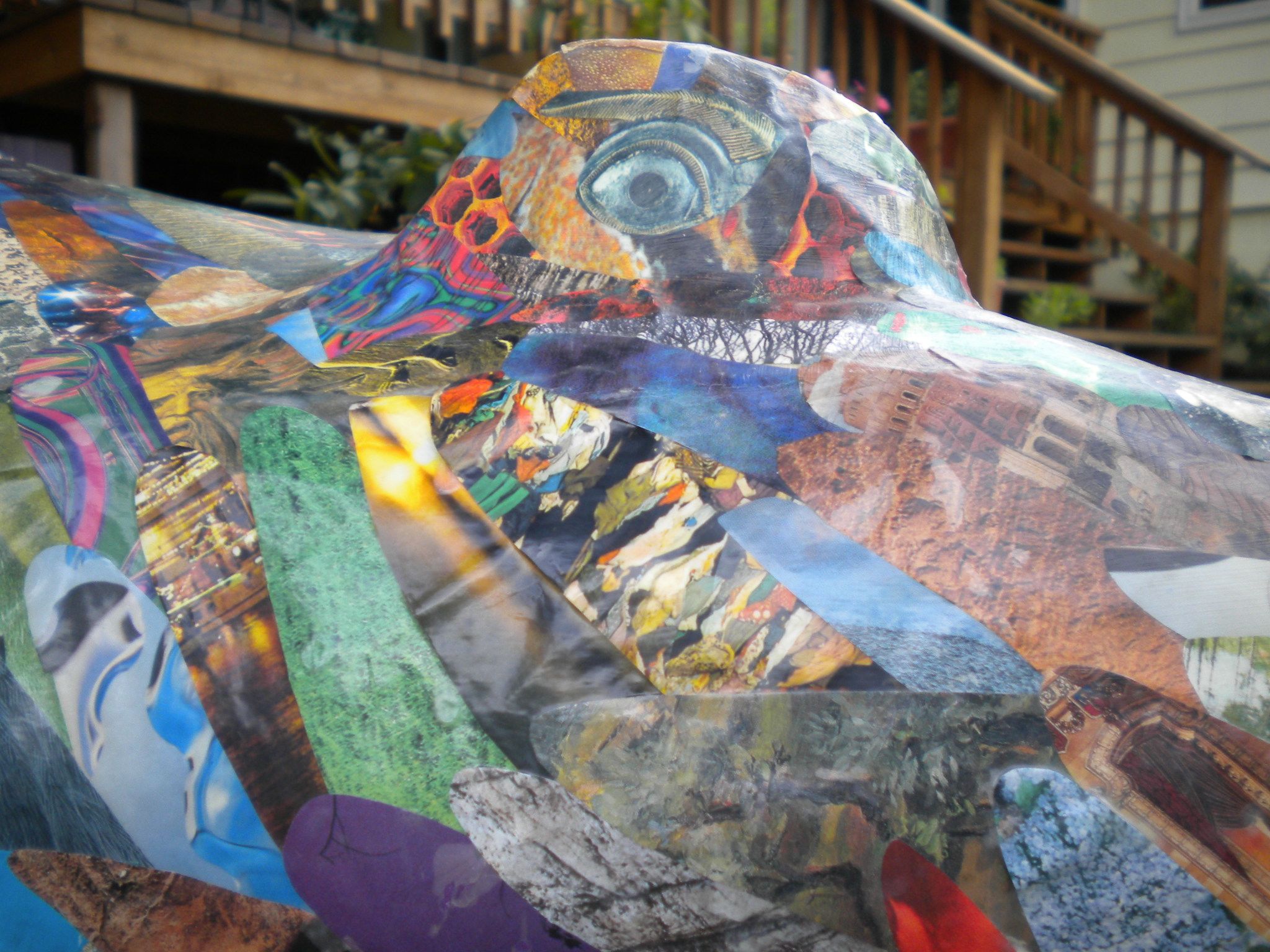Next the Flying Alligator, which was once my son’s ocean-worthy float toy, until it sprang a slow leak that led to its ultimate preservation in untold layers of papier-mache and feather-shaped images. Each image on the alligator’s surface is unique–hand cut from magazines and applied to create a colorful dynamic texture when perceived from a distance. Images of Jack Kerouac, Allen Ginsberg, Neal Cassady and Jerry Garcia are discreetly sprinkled into the gator’s feathery coat.