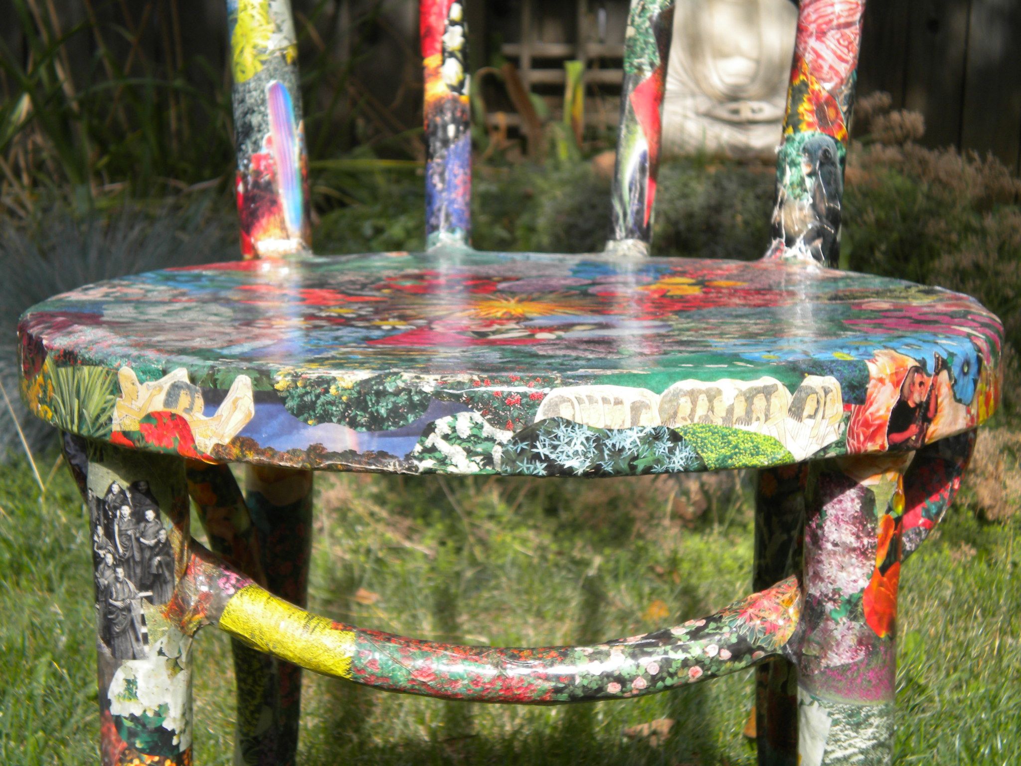 Posted: October 6, 2010 in Collage-SculpturesTags: functional art, Garden collage chair, papier-mache furniture, surreal collage