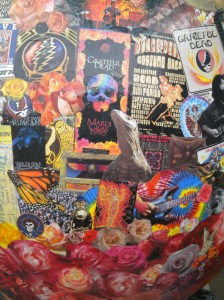 World of Dead and Roses places my stash of Grateful Dead images atop a bowl of more than 1,000 roses, all cut from rose catalogs. I once wrote catalogs for Jackson & Perkins, one of the nation’s largest purveyors of roses. The five years worth of seasonal catalogs I collected provided the ammo for more than one thousand unique rose images. The Dead material came from my personal collection of magazines, photos, tickets and handbills gathered since the mid-1970s.