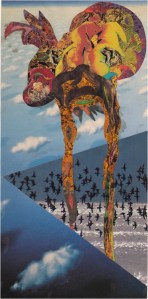 Next the Flying Alligator, which was once my son’s ocean-worthy float toy, until it sprang a slow leak that led to its ultimate preservation in untold layers of papier-mache and feather-shaped images. Each image on the alligator’s surface is unique–hand cut from magazines and applied to create a colorful dynamic texture when perceived from a distance. Images of Jack Kerouac, Allen Ginsberg, Neal Cassady and Jerry Garcia are discreetly sprinkled into the gator’s feathery coat.